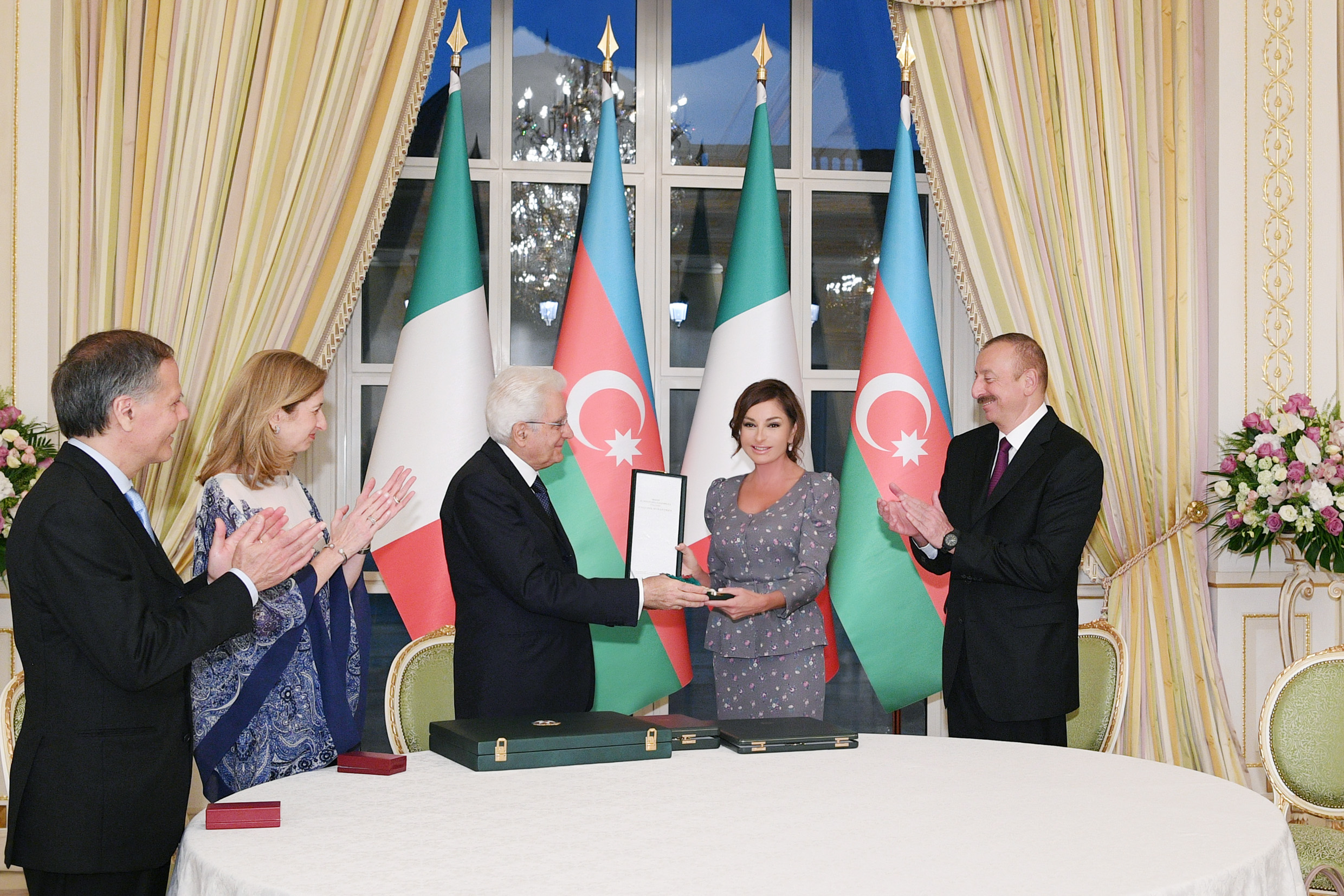 On July 12, 2018, Mehriban Aliyeva was honoured with the order of Knight Grand Cross “For Merits” of the Italian Republic. This order is honoured with for significant services to the people in such spheres as economy, public and humanitarian activities, charity, literature, art etc. On July 18, 2018, President of the Italian Republic Sergio Mattarella, in the framework of his official visit to the Republic of Azerbaijan, presented the order to Mehriban Aliyeva. |
