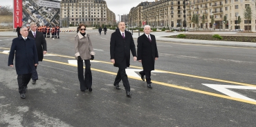 Prezident İlham Əliyev Xaqani Rüstəmov küçəsi, bu küçənin üzərində yerləşən dairə və dördçıxışlı piyada keçidinin rəmzi açılışını bildirən lenti kəsib.