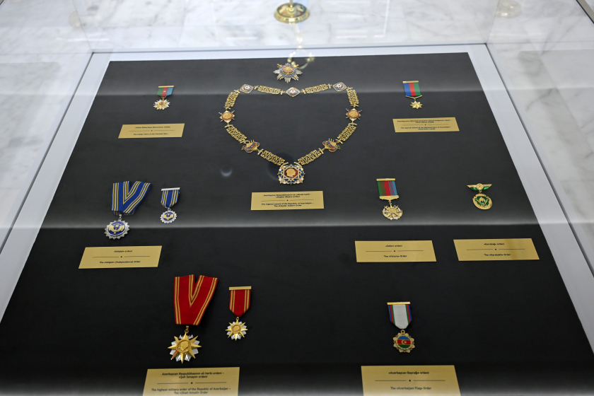 In Exhibition Hall A, visitors can view flags, flagstaffs, symbols of government, coins, and weapons from Azerbaijan's ancient and medieval periods, as well as coats of arms from 19th-century cities of Azerbaijan.