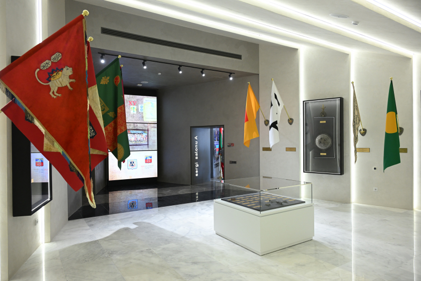 The National Flag Museum, opened by President Ilham Aliyev and his wife Mehriban Aliyeva on November 9, 2010, has since showcased the National Flag of Azerbaijan, along with the flags of various khanates and states that existed in the country at different times. The museum displays 400 items that reflect Azerbaijan's ancient and rich history of statehood.