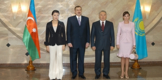 Sarayın qarşısında Prezident İlham Əliyevi və xanımı Mehriban Əliyevanı Qazaxıstan Prezidenti Nursultan Nazarbayev və qızı Dariqa Nazarbayeva qarşıladılar.