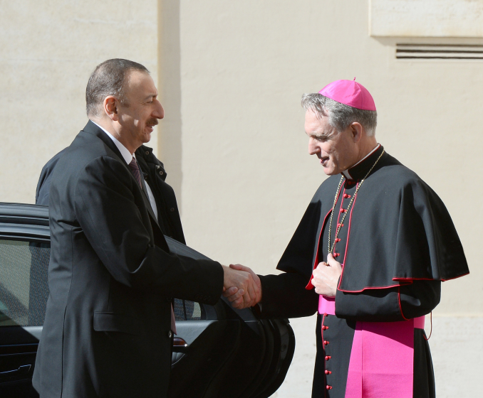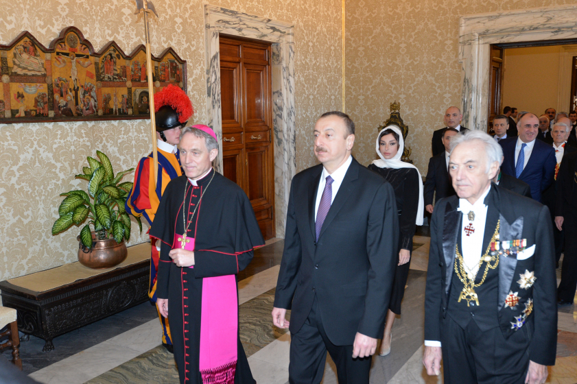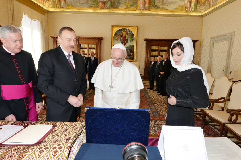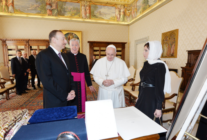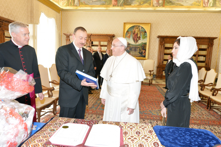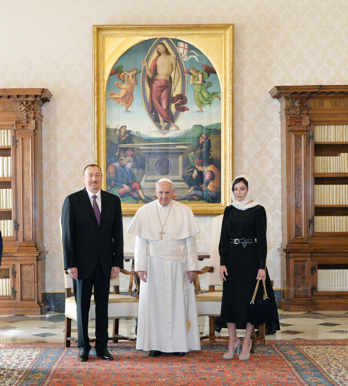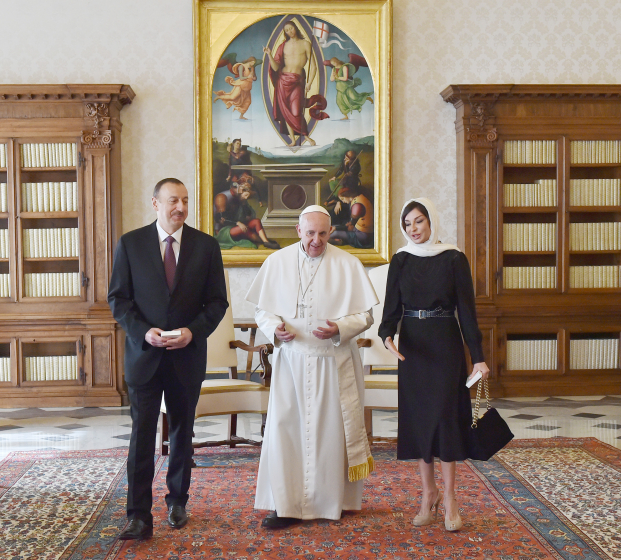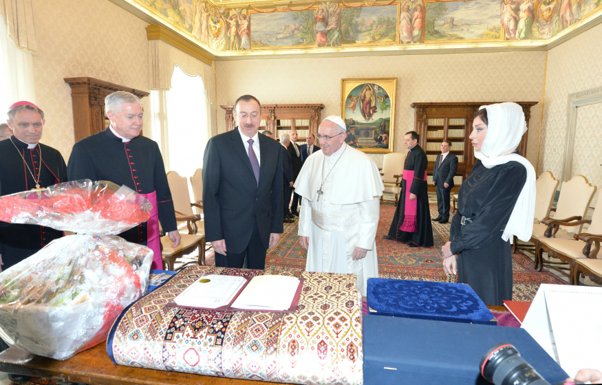 На встрече Президента Азербайджана Ильхама Алиева, его супруги Мехрибан Алиевой и главы Католической церкви Папы Франциска было выражено удовлетворение высоким уровнем двусторонних связей между Азербайджаном и Ватиканом, а также подчеркнуты хорошие перспективы этих отношений. На встрече Президента Ильхама Алиева, его супруги Мехрибан Алиевой с главой Католической церкви отмечалось, что Ватикан дает высокую оценку и важное значение связям с Азербайджаном. Было доведено до внимания, что значение, которое придает Азербайджан межкультурным и межрелигиозным отношениям, играет важную роль в развитии двустороннего сотрудничества. На встрече было подчеркнуто существование образцовой среды толерантности в Азербайджане, где представители всех религиозных конфессий живут в атмосфере мира и благополучия.