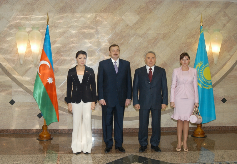 Президента Азербайджана Ильхама Алиева и его супругу Мехрибан Алиеву перед дворцом встречали Президент Казахстана Нурсултан Назарбаев и его дочь Дарига Назарбаева.