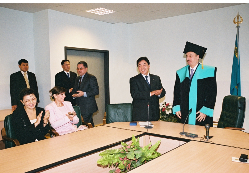Затем состоялась встреча Президента Азербайджана Ильхама Алиева с преподавателями и студентами этого высшего учебного заведения. Ректор Шарсенгали Абдыманапов зачитал решение Ученого совета о присвоении Президенту Ильхаму Алиеву звания почетного доктора университета, вручил главе нашего государства диплом и мантию почетного доктора.