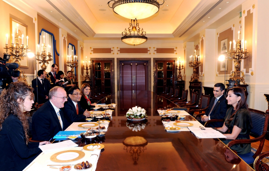 Приветствуя гостя в Фонде, первая леди Азербайджана сказала, что поддерживает деятельность ЮНИСЕФ в нашей стране. Отметив, что между Фондом и ЮНИСЕФ сложились тесные связи, Мехрибан ханум Алиева подчеркнула, что это сотрудничество не является случайным. Основная цель обеих структур – забота о детях. Решение проблем детей составляет приоритетное направление деятельности Фонда Гейдара Алиева.