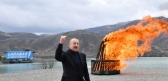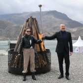 20.03.2022Президент Азербайджанской Республики Ильхам Алиев и первая леди Мехрибан Алиева разожгли в поселке Суговушан Тертерского района праздничный костер.